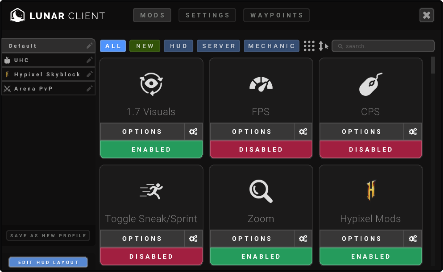 - Built-in mods (FPS boost, HUDs, Keystrokes)